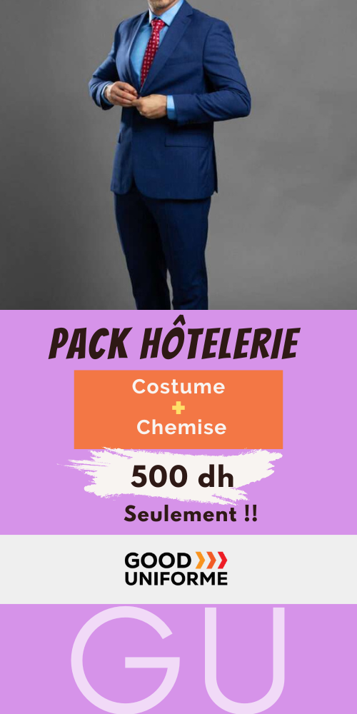 Dans le secteur de l’hôtellerie, l’apparence et la présentation du personnel jouent un rôle essentiel dans l’image et la réputation d’un établissement. Un costume professionnel avec chemise pour agent hôtelier permet de transmettre une image de sérieux, d’élégance et de professionnalisme auprès des clients. Pour répondre aux besoins des hôtels, riads, maisons d’hôtes et établissements touristiques, nous proposons une offre exceptionnelle : costume avec chemise pour agent hôtelier à seulement 500 DH.